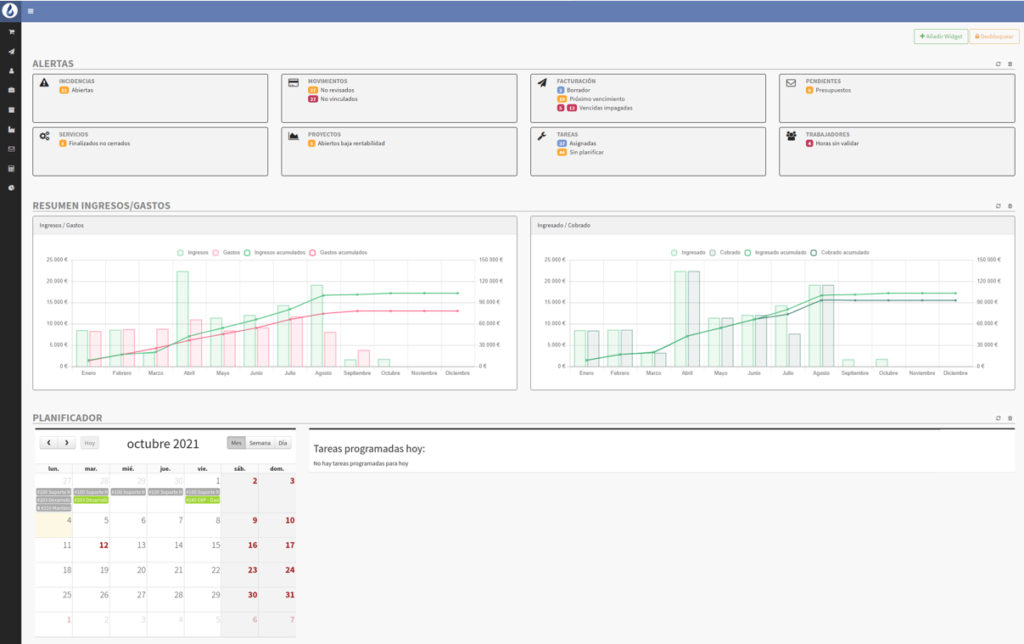 - Panel de control personalizable mediante widgets modulares, con avisos y alertas para cada módulo., y envío de email resumen con incidencias, recordatorios y alertas.