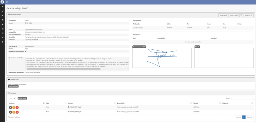 - Gestión digital de partes de trabajo, creación de plantillas en PDF, envío automático a clientes.