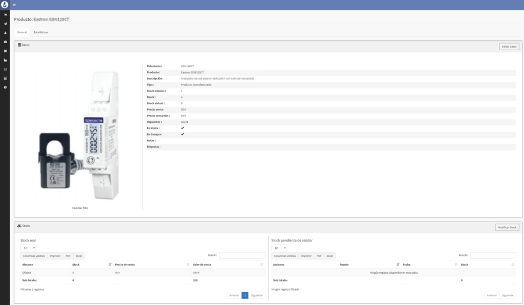 - Gestión de inventario multi-almacén. Materias primas y productos manufacturados, stock real y pendiente de validar. Estadísticas de compras y ventas.