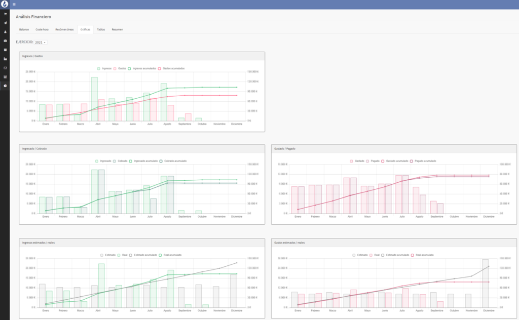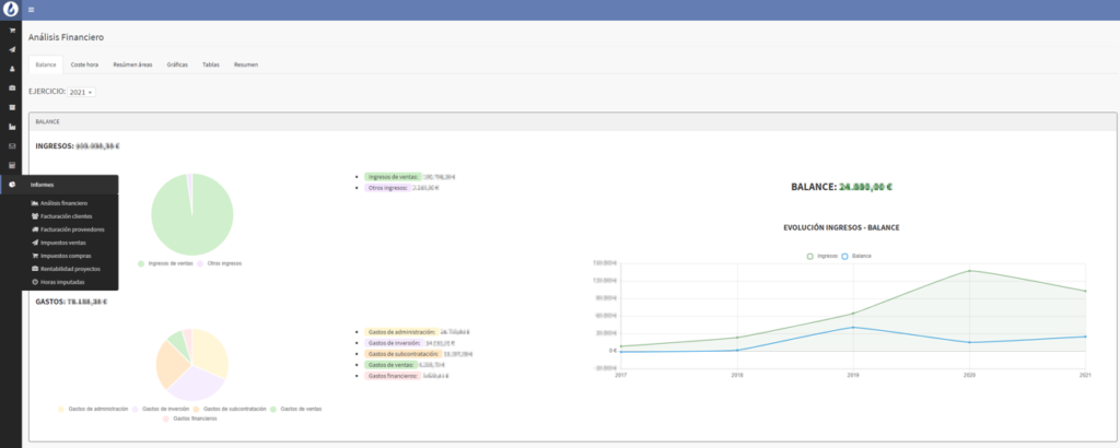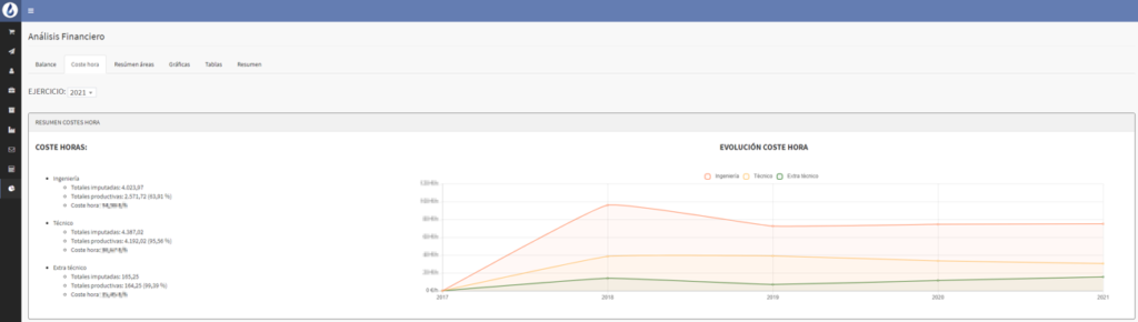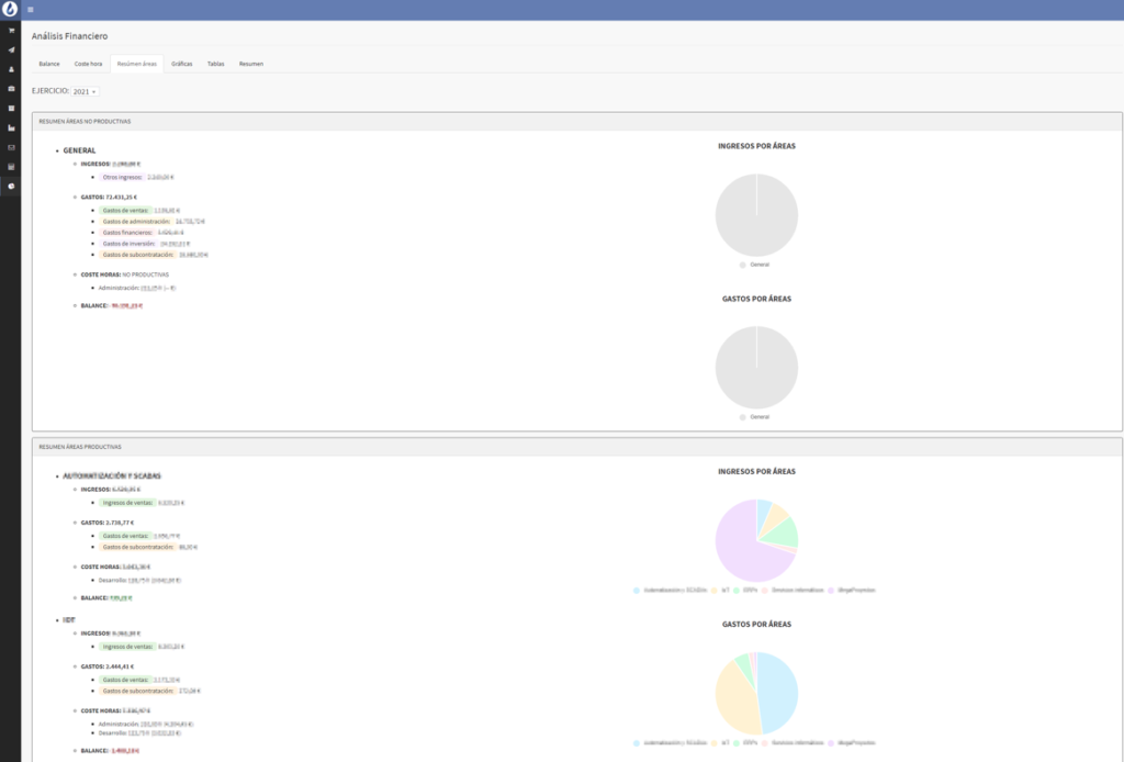 - Análisis financiero por ejercicio. Control de ingresos y gastos. Evolución en el tiempo. Análisis del coste hora en base a horas imputadas y productivas. Evolución en el tiempo. Control y resumen por áreas de negocio.