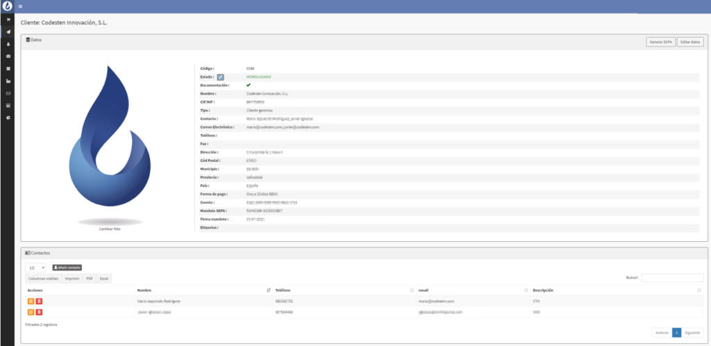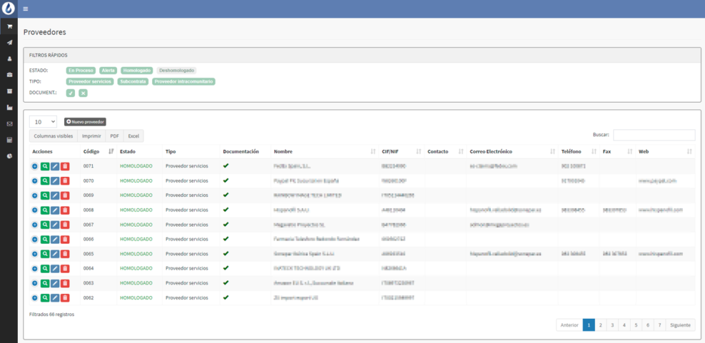- Tablas de datos, con filtros rápidos, campos ordenables y personalizables por usuario, y exportación personalizada en PDF y Excel.