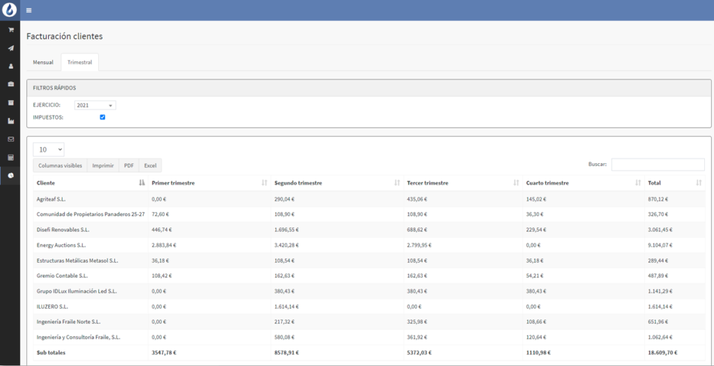 - Resúmenes de facturación e impuestos. Períodos mensuales o trimestrales.